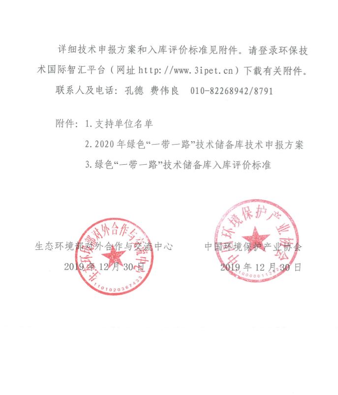 为促进“一带一路”共建国家的环保技术交流和产业合作,推动国内外环保先进实用技术推广应用,服务绿色“一带一路”建设和打好污染防治攻坚战,在生态环境部相关部门指导下,生态环境部对外合作与交流中心设立了绿色“一带一路”技术储备库(简称技术库)。为做好技术库建设工作,生态环境部对外合作与交流中心与中国环境保护产业协会联合开展2020年绿色“一带一路”技术储备库技术征集活动。本次活动将根据“一带一路”共建国家环境质量改善需求面向国内外征集大气、水、土壤污染防治,固废处理处置和环境监测等领域优秀环保技术,并组织权威专家对技术的先进性、实用性、经济性、成熟度以及企业的服务能力进行入库评价。入库技术将在“一带一路”生态环保大数据服务平台上发布。脱硫脱硝除尘技术、机动车污染控制技术、VOCs排放控制技术、扬尘污染控制技术。安全饮用水供给技术、工业废水(含工业园区)治理技术、面源污染控制技术、城镇污水处理技术、黑臭水体污染防治技术。土壤调查与勘测技术、风险评估技术、工业污染场地(土壤和地下水)修复技术、矿山生态恢复技术、农田土壤治理与改良技术。生活垃圾分类与资源化技术、厨馀垃圾处理技术、工矿业固废再利用技术、垃圾渗滤液处理技术、危险废物处理处置与资源化技术。特征污染物在线监测设备、土壤(含土壤气)及地下水监测技术、废气污染源挥发性有机物监测技术、大气挥发性有机物监测技术、园区环境监测及溯源技术、智慧水务相关技术。4. 具有3个规模化以上应用实例,包括在中国国内、“一带一路”共建国家或其他国家/地区的应用实例;6. 属于成熟的系统构成、工艺流程、工艺单元或设备/材料/药剂。1. 申报企业为该技术的持有单位,即专利证书或鉴定证书的完成单位;2. 具有相应的研究、开发、设计、生产和推广能力。1. 《2020年绿色“一带一路”技术储备库技术申报表》(附件2-1);2. 申报技术的《技术报告》(编写要求见附件2-2);3. 技术工程应用的《典型案例》介绍(编写要求见附件2-3);4. 典型案例相应的项目验收报告、验收监测报告或由具有资质的第三方机构出具的性能测试(评价)报告;6. 其他:法人营业执照、专利证书、获奖(或技术鉴定、评定、推荐)证书、资质证书等影印件。此次征集活动的评价流程包括:申报材料形式审查、专家技术函询、专家会商、案例考察和技术公示。入库技术将免费在“一带一路”生态环保大数据服务平台和环保技术国际智汇平台线上展示、优先向地方需求项目和工业园区推广、优先向“一带一路”共建国家需求项目推广、优先获得金融资本支持。请按照申报材料要求,由技术持有单位填写《2020年绿色“一带一路”技术储备库技术申报表》和《企业信息表》,编写技术报告和典型案例,于2020年3月10日前将纸质版申报材料(装订成册,一式四份)及申报材料电子文件(光盘一份,将申报材料压缩为一个文件,以“技术领域+技术名称+申报单位名称”命名,申报材料为word文档)直接送达或者邮寄至生态环境部对外合作与交流中心。采用邮寄方式的,请在申请截止日期前以快递方式邮寄。邮 箱:kong.de@fecomee.org.cn邮寄地址:北京西城区后英房胡同5号315室,邮编100035请登录“一带一路”生态环保大数据服务平台(网址: http://greenbr.org.cn/)、环保技术国际智汇平台(网址http://www.3ipet.cn)或点击“下载附件”。