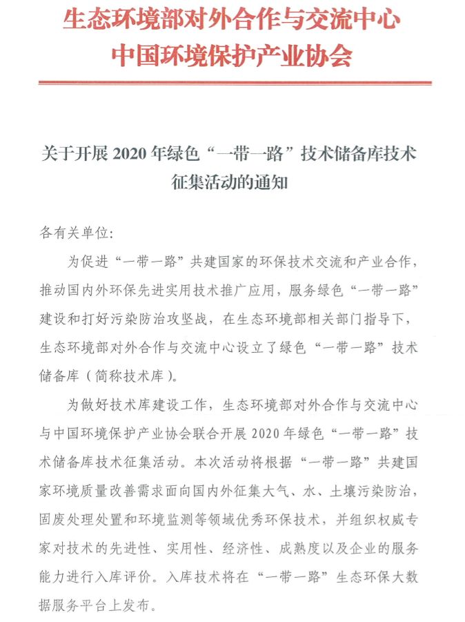 为服务绿色“一带一路”建设和打好污染防治攻坚战,生态环境部对外合作与交流中心设立了绿色“一带一路”技术储备库。为做好技术库建设工作,对外合作与交流中心与中国环境保护产业协会联合开展2020年绿色“一带一路”技术储备库技术征集活动,面向国内外征集大气、水、土壤污染防治,固废处理处置和环境监测等领域优秀环保技术。入库技术将在“一带一路”生态环保大数据服务平台上发布,并进行宣传推广。申报截止时间为2020年3月10日,欢迎大家积极申报。