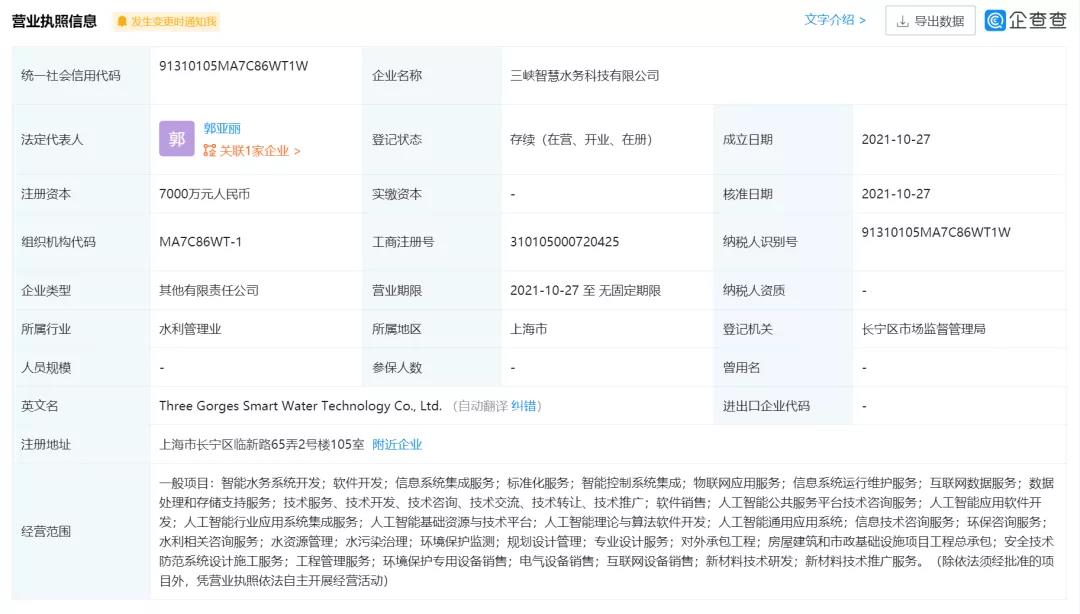 此外,企查查信息显示,日前三峡智慧水务科技有限公司在上海长宁区注册成立,注册资本为7000万元,公司股东为长江生态环保集团有限公司、上海勘测设计研究院有限公司、三峡科技有限责任公司、三峡基地发展有限公司,四者持股比例分别为35%、35%、25%、5%。