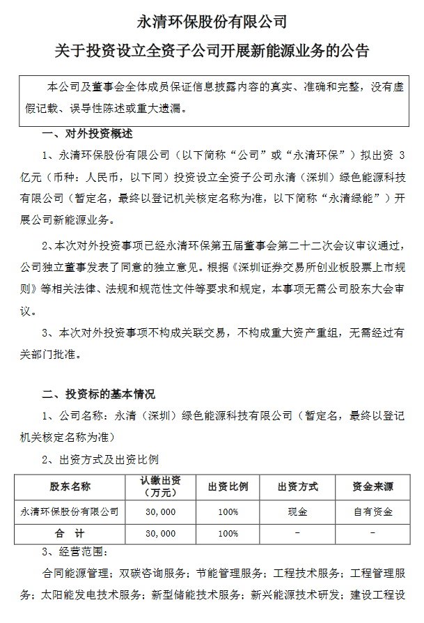 永清环保公布,公司拟出资3亿元投资设立全资子公司永清(深圳)绿色能源科技有限公司开展公司新能源业务。