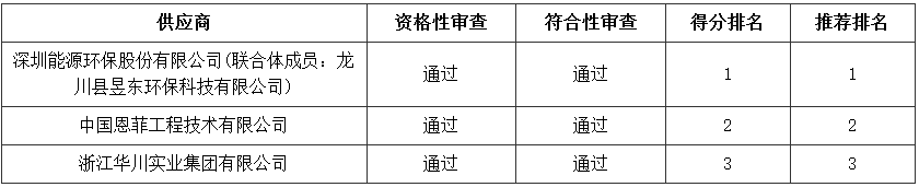 广东省龙川县能源生态园项目发布中标结果公示,深圳能源环保股份有限公司(联合体成员:龙川县昱东环保科技有限公司)、中国恩菲工程技术有限公司、浙江华川实业集团有限公司三家企业参与投标,其中深圳能源环保股份有限公司联合龙川县昱东环保科技有限公司中标该项目,投标报价为389元/吨,其中生活垃圾处理费报价126元/吨,餐厨垃圾处理费(含收运)运营服务费263元/吨。